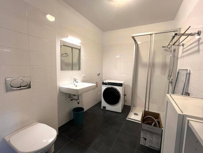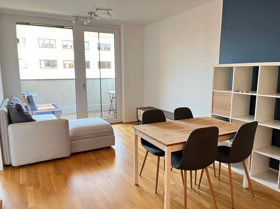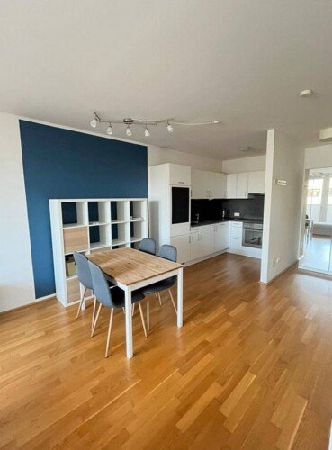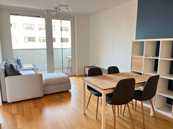 Diese Wohnung ist teilweise möbliert und überzeugt mit einer modernen und praktischen Ausstattung. Der Wohnbereich ist mit einer komfortablen Couch und einem Essbereich eingerichtet. Die offene Küche ist in hellen Tönen gehalten und mit hochwertigen Geräten ausgestattet. Das Badezimmer verfügt über eine Dusche und bietet Platz für eine Waschmaschine. Der großzügige Balkon ist ideal für gemütliche Stunden im Freien.